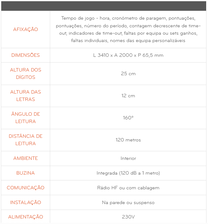 Este marcador de grande dimensão foi especialmente projetado para andebol, pois exibe duas linhas de contagem decrescente que indicam o tempo de penalidade. É também adequado para basquetebol, exibindo faltas individuais. Este marcador desportivo é também adequado para desportos que exijam a afixação dos resultados dos sets, tais como voleibol, ténis, padel, badminton, etc.